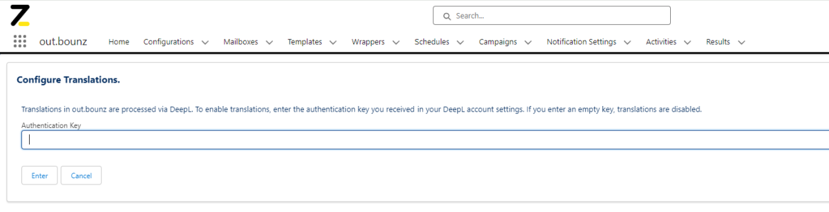 The interface for configuring and using out.bounz is made up exclusively of native Salesforce components. You will find the following tabs in the application: